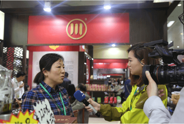 茶展期间,赵李桥茶厂副总经理金莉(左)不断接受媒体采访。