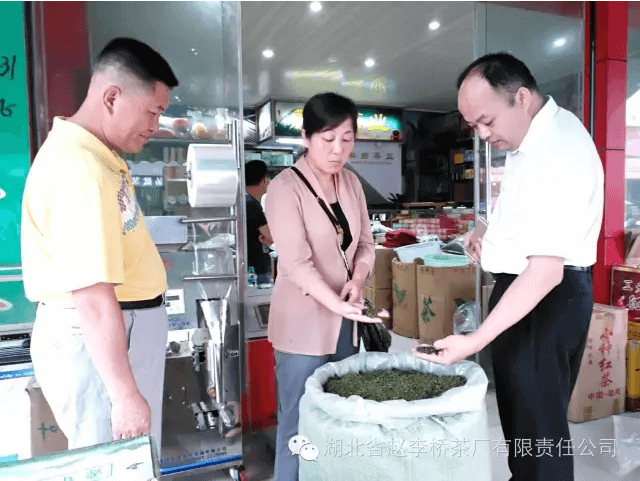 6月18日上午,赣州总代肖永平(右一)陪同赵李桥茶厂总经理金莉(中间)考察赣州茶叶市场、了解品牌布局和销售情况
