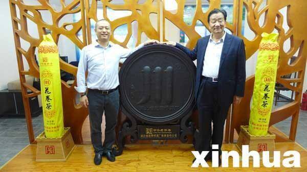 11月6日,赵李桥茶厂董事长李勇(左)与中国茶叶流通协会常务副会长王庆(右)在“川”字牌巨型茶饼旁合影留念。