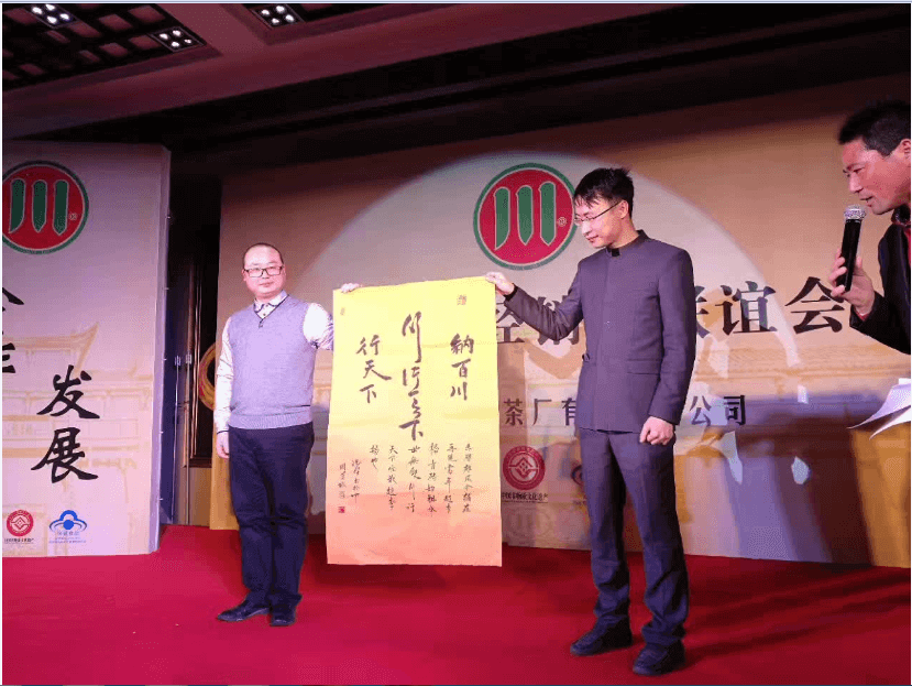 湖北省赵李桥茶厂有限责任公司总经理王冬阳(左)接受汉城国际大酒店总经理李渊泽(右)赠送的《川行天下》书法
