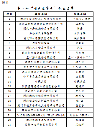 为深入贯彻湖北省品牌强省战略,充分发挥老字号扩内需、促消费的重要作用,按照《“湖北老字号”认定办法》(鄂商务发〔2014〕131号)、《关于开展第二批“湖北老字号”认定工作的通知》(鄂商办发〔2016〕19号)等文件的有关要求,经各地商务主管部门组织申报,湖北省商务厅组织专家评审和网上公示,厅长办公会研究认定湖北省赵李桥茶厂有限责任公司等23家企业(品牌)为第二批“湖北老字号”(详见附件)。