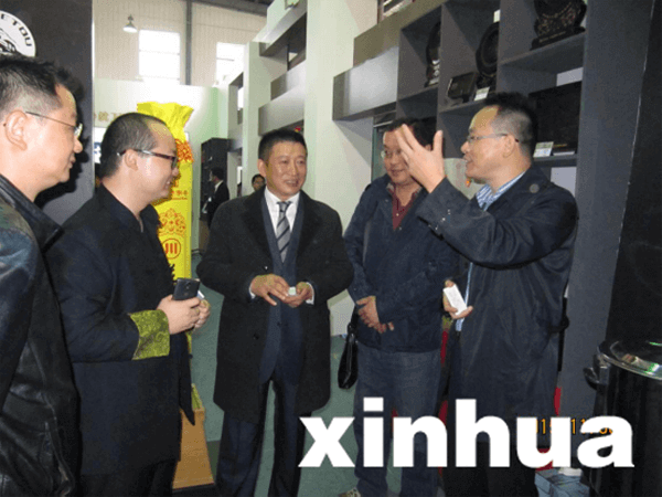 11月6日,湖北赤壁,湖北同济堂药房有限公司总经理徐忠强(右一)与湖北省赵李桥茶厂副董事长张作然(中)、总经理王冬阳(左二)探讨合作。