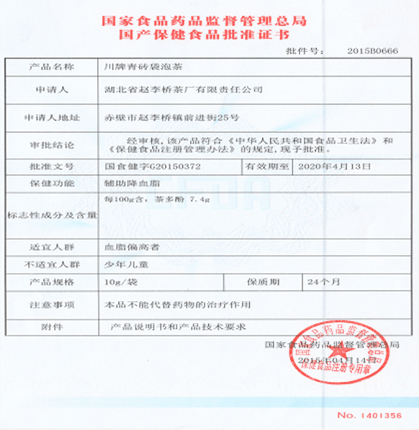 11月12日,湖北省赵李桥茶厂收到批件号为“201580666”、批准文号为“国食健字G20150372”的保健食品批准证书。