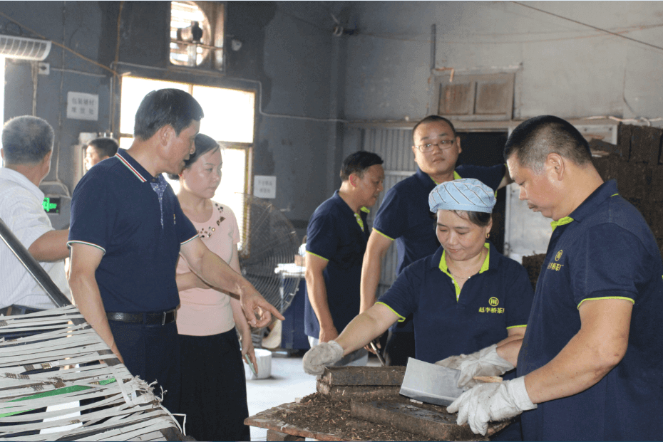 省直机关工委副书记于春利(左二)深入烘包车间了解情况,公司执行董事李云(左三)陪同