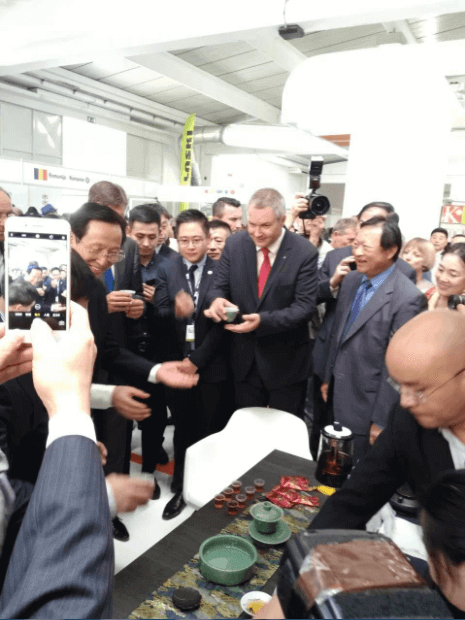 斯洛文尼亚总统博鲁特·帕霍尔(中)亲临公司展区并品饮川字牌青砖茶