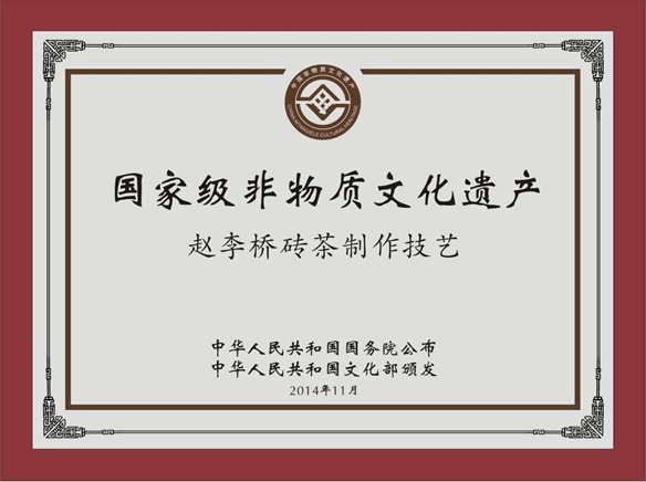 “赵李桥砖茶制作技艺”于2014年10月被录入第四批国家级非物质文化遗产代表性项目名录。