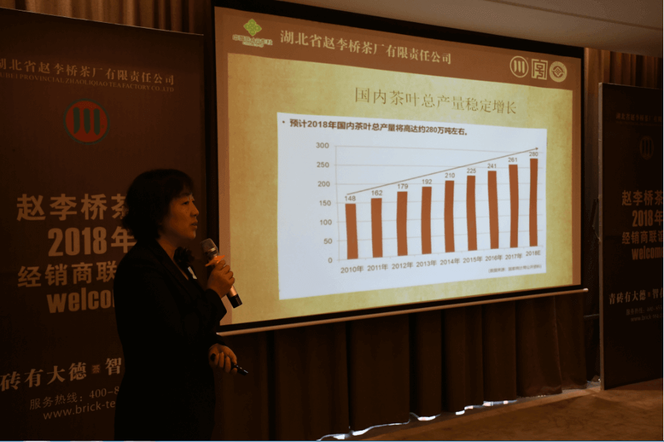 本次大会旨在收集信息、统一思想、扩大网络。副总经理金莉首先对与会代表作了精彩的《青砖茶市场分析报告》,获得广大经销商的一致认可,并对今后经营好“川”字青砖茶充满了信心。销售部罗进启部长根据对行业内二十年的发展,准确分析赵李桥茶厂今后前进的方向,具体措施是要进一步打造七大重点城市场(呼和哈特、北京、上海、广州、武汉、成都、赤壁),实现与全国各地经销商的合作共赢。