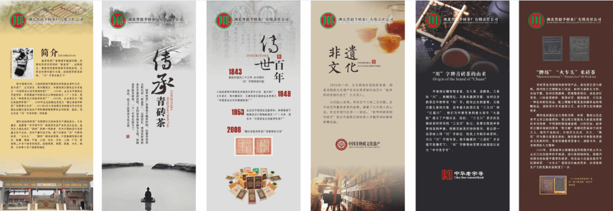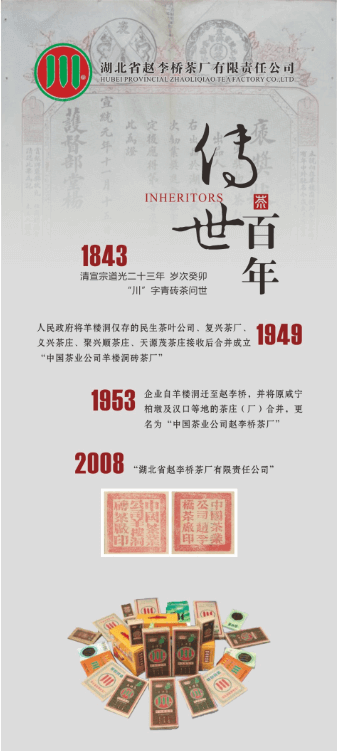 湖北省赵李桥茶厂有限责任公司,砖茶生产历史悠久,源自唐、兴于宋、盛于清,久负盛名。是拥有“中华老字号”和“中国驰名商标”的省级农业产业化龙头企业;“青砖茶”、“米砖茶”国家标准(GB)起草单位;历史上闻名遐迩的“川”字茶唯一传承者;国家级非物质文化遗产赵李桥砖茶制作技艺唯一传承保护单位;国家定点边销茶原料储备单位。作为中国紧压茶行业的重点生产企业,茶厂年产量达万吨。旗下主要有“川”字牌青砖茶,“火车头”牌、“牌坊”牌米砖茶等产品,畅销内蒙古、新疆、青海、宁夏、山西、山东、河北、北京、上海、广州、香港等二十多个省市和地区,远销欧盟、俄罗斯、韩国、日本等十多个国家和地区。