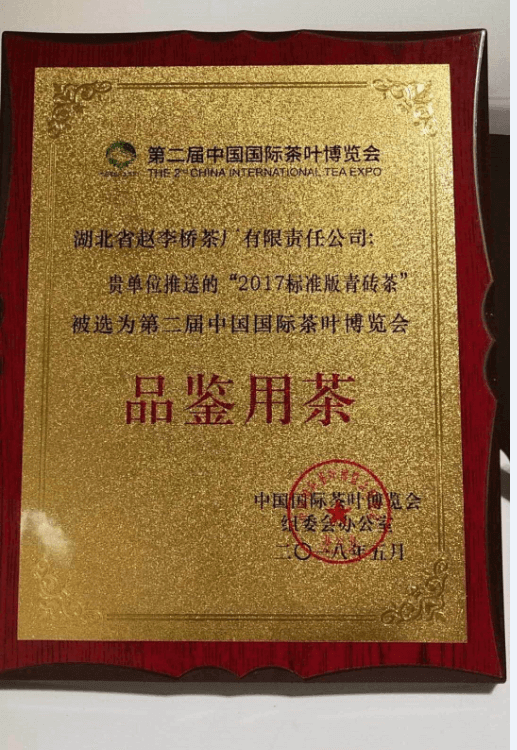 5、赵李桥茶厂出品的“2017标准版青砖茶”入选“第二届中国国际茶叶博览会指定品鉴用茶”,组委会将在展会期间全程推广使用品鉴茶。