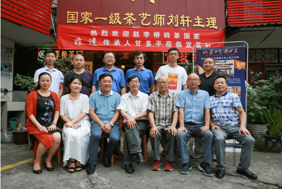 赵李桥砖茶制作技艺第四代代表性传承人甘多平(前排左三)与品鉴会各位嘉宾合影
