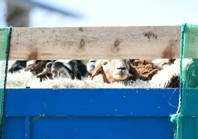 这是10月22日在内蒙古二连浩特口岸拍摄的蒙古国捐赠的羊。新华社记者彭源摄