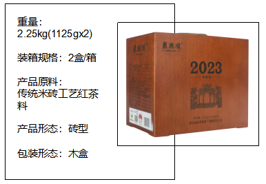 聚兴顺2023米砖色泽乌黑油润,产品砖面图案精美,如夜空中群星璀璨生辉,汤色深红,香气馥郁陈香,口感醇厚丝滑糯香持久回甘悠长,米砖茶采用简洁大方的精致原木盒作为产品外包装,两片装的礼盒形式又有中国传统文化“好事成双”的寓意,包装精致。