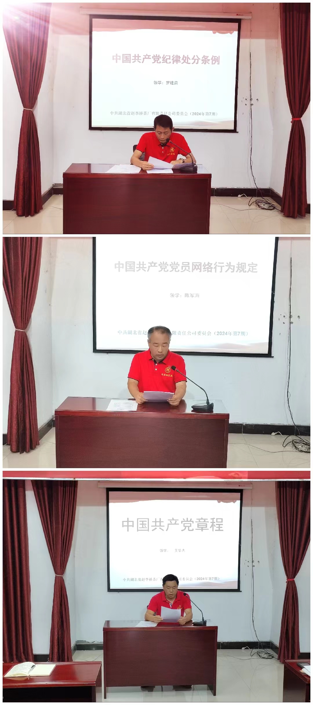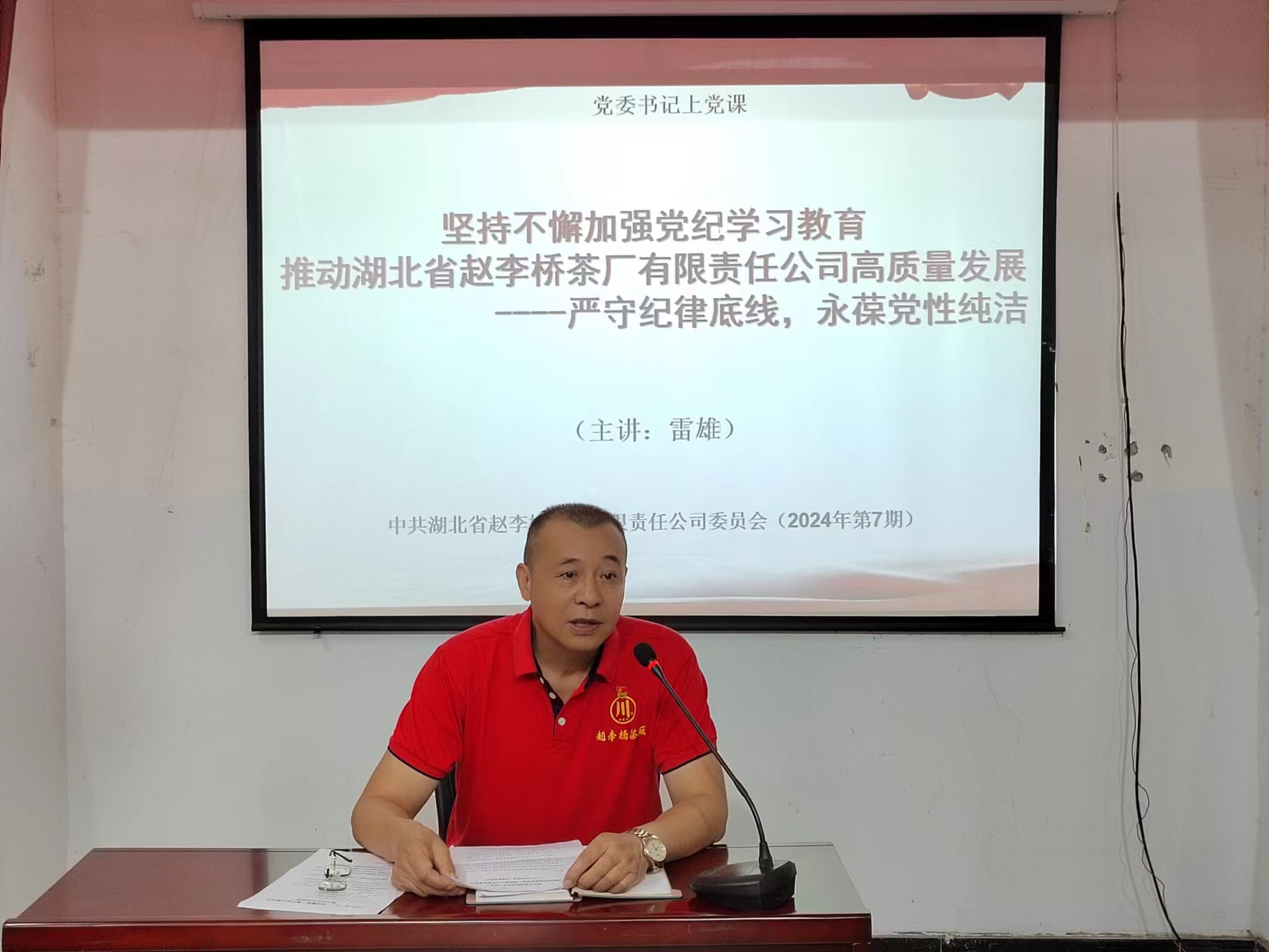 公司党委书记雷雄给全体党员讲授了坚持不懈加强党纪学习教育、推动湖北省赵李桥茶厂有限责任公司高质量发展的党课,对《条例》的重点内容与关键条款进行了解读。
