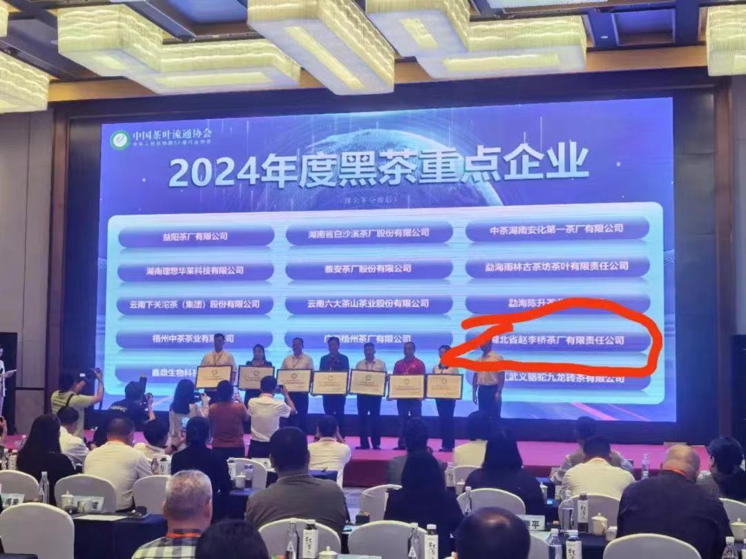 在黑茶产业新质生产力发展会议上,湖北省赵李桥茶厂有限责任公司荣获 “2024 年度黑茶重点企业” 荣誉称号,这是对赵李桥茶厂在黑茶领域卓越贡献的高度认可。