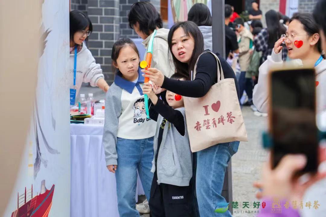 在展位的另一侧,游客们沉浸在“草船借箭”趣味游戏、幸运大转盘等互动环节中,赢取了与赤壁青砖茶相关的小礼品。大家积极参与,笑声、欢呼声此起彼伏,现场气氛热烈非凡。