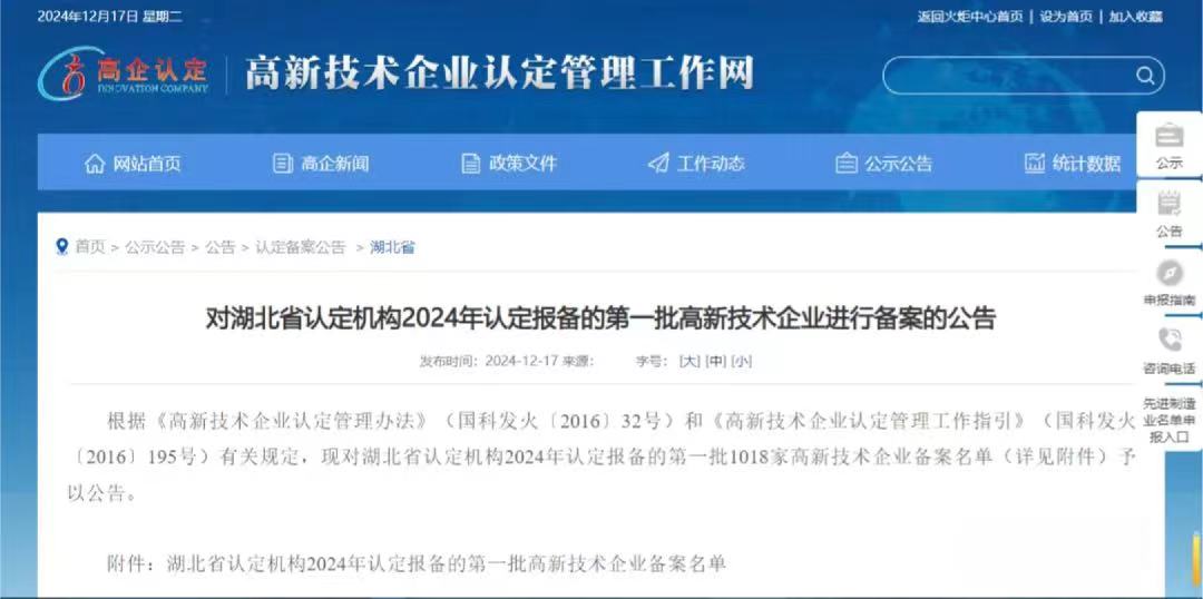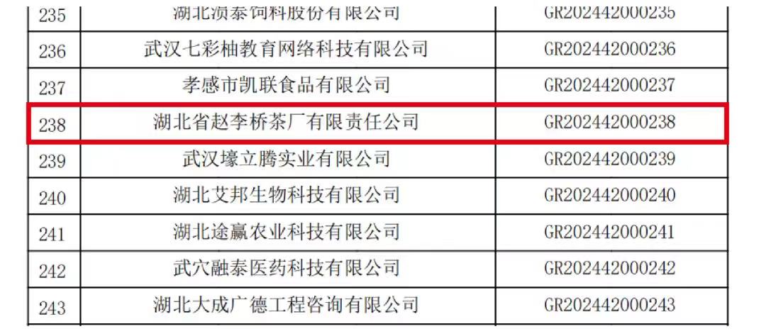 2024年12月17日,全国高新技术企业认定管理工作领导小组办公室发布了《对湖北省认定机构2024年认定报备的第一批高新技术企业进行备案的公告》,湖北省赵李桥茶厂有限责任公司位列其中,标志我公司成功通过全国高新技术企业认定。