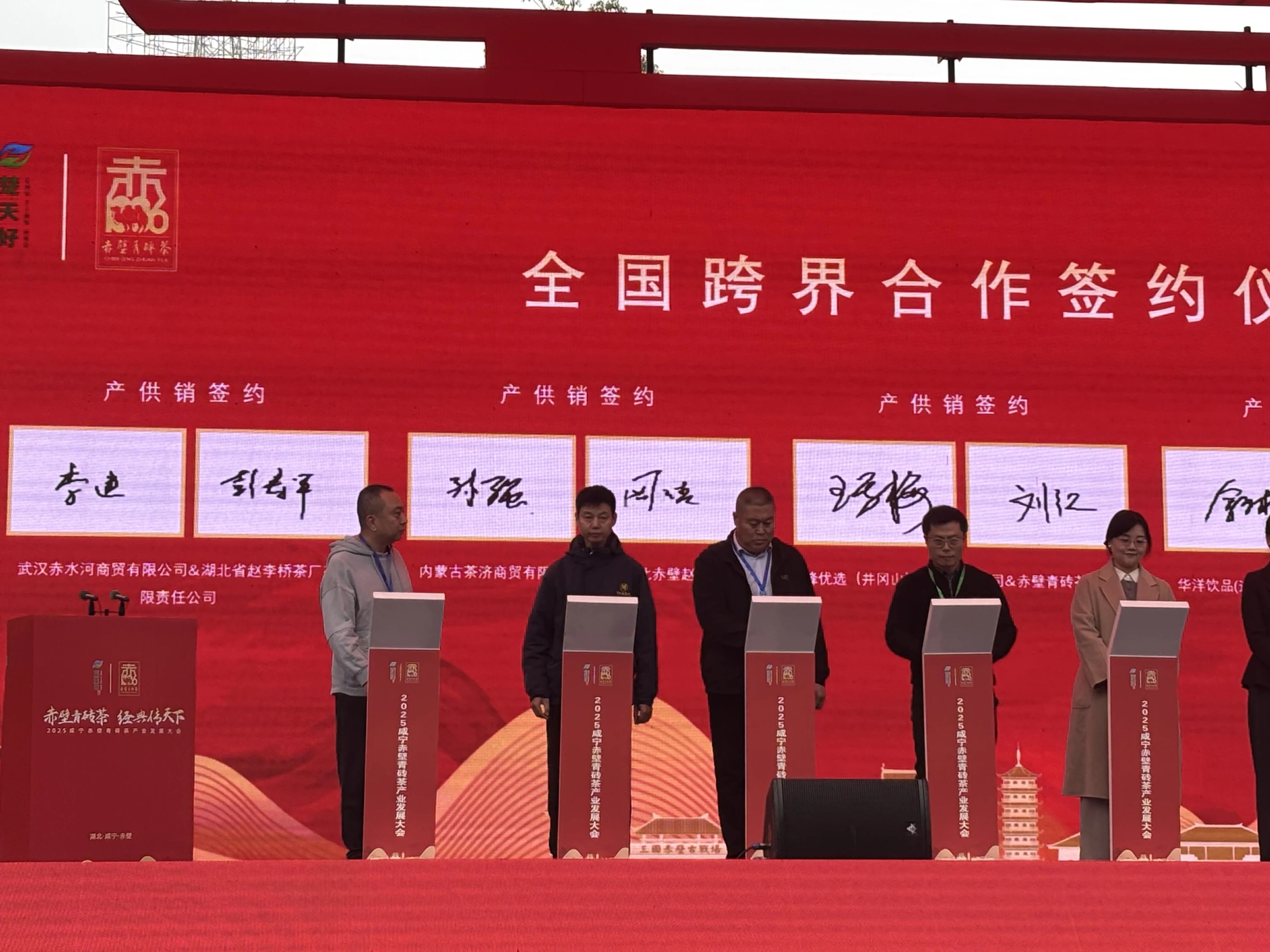 活动现场,在全场嘉宾的共同见证下,湖北省赵李桥茶厂有限责任公司与鄂尔多斯市恒得利商贸有限公司、武汉赤水河商贸有限公司举行了隆重的签约仪式。茶厂代表与两家企业负责人郑重签署合作协议,标志着三方将在青砖茶产品推广、渠道拓展、品牌共建等领域展开深度合作,为产业发展注入新动能。