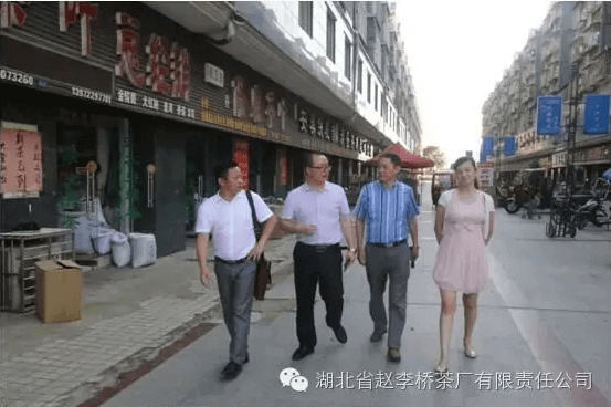 6月17日下午,赵李桥茶厂总经理王冬阳(左二)与夏丽丽(右一)一起考察襄阳彩虹门茶叶市场。
