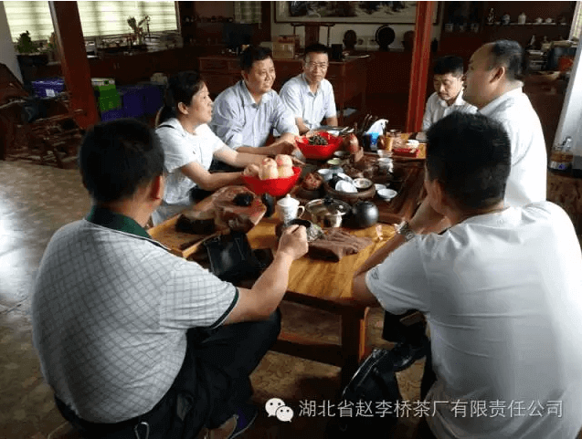 6月17日上午,赵李桥茶厂副总经理金莉(左二)首次来到赣县与赣州总代肖永平(右二)洽谈青砖茶市场推广事宜。