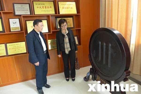 11月5日,赵李桥茶厂副总经理甘多平(左)陪同杭州茶叶研究院副院长杨秀芳(右)欣赏“川”字牌巨型茶饼。
