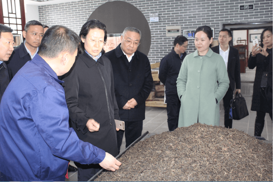 “赵李桥砖茶制作技艺”第五代传承人权威(左一)向邱丽新厅长(左二)、江斌书记(左三)介绍生产加工工艺及流程
