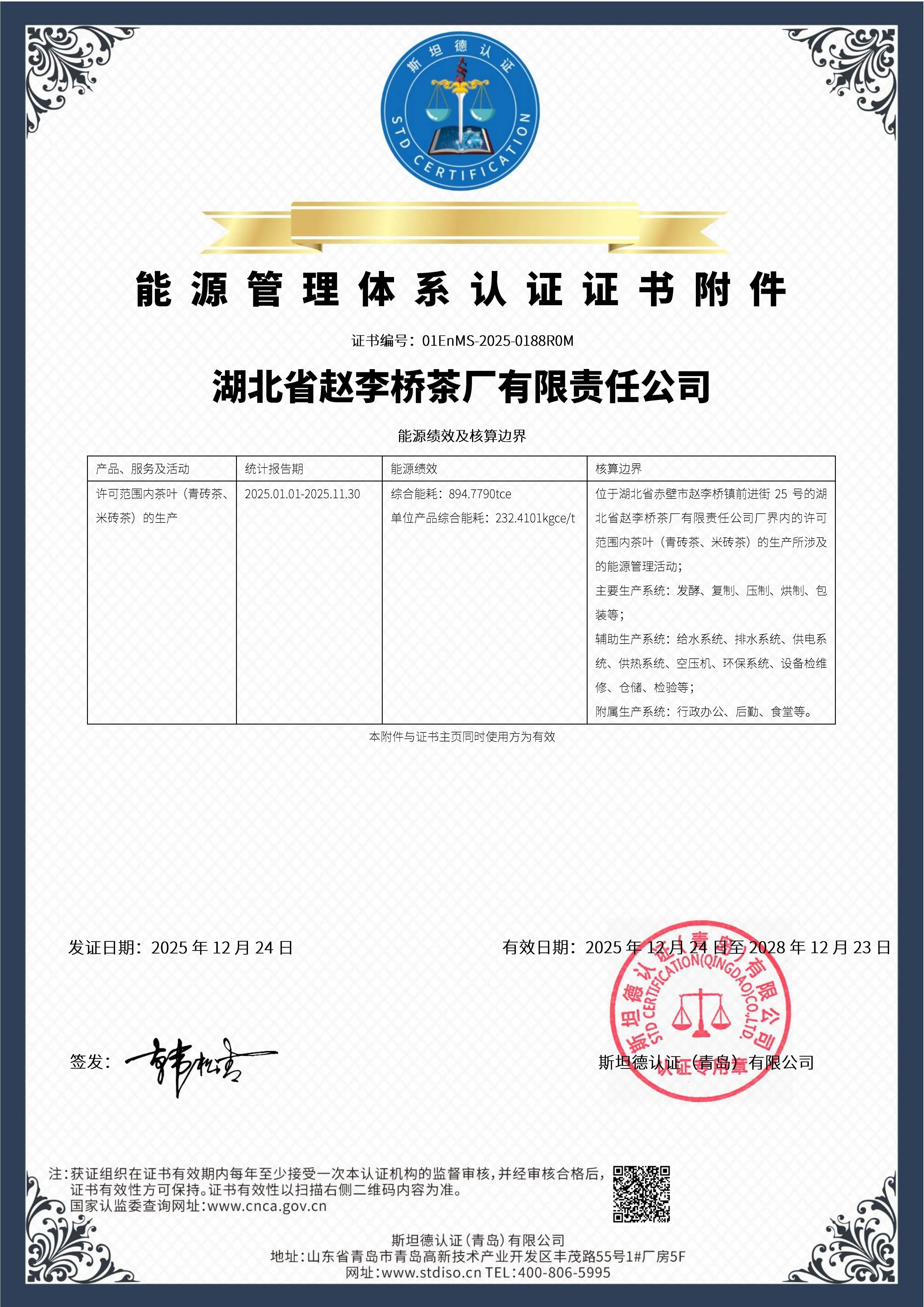 2025年12月24日,通过权威认证机构的评审,湖北省赵李桥茶厂有限责任公司顺利通过能源管理体系审核,成功获得依据GB/T23331-2020/ISO50001: 2018;RB/T120-2015标准的能源管理体系认证证书!标志着企业在能源规划、能源消耗管控上已建立起科学、规范且符合国家标准的管理体系,开启了绿色发展未来!